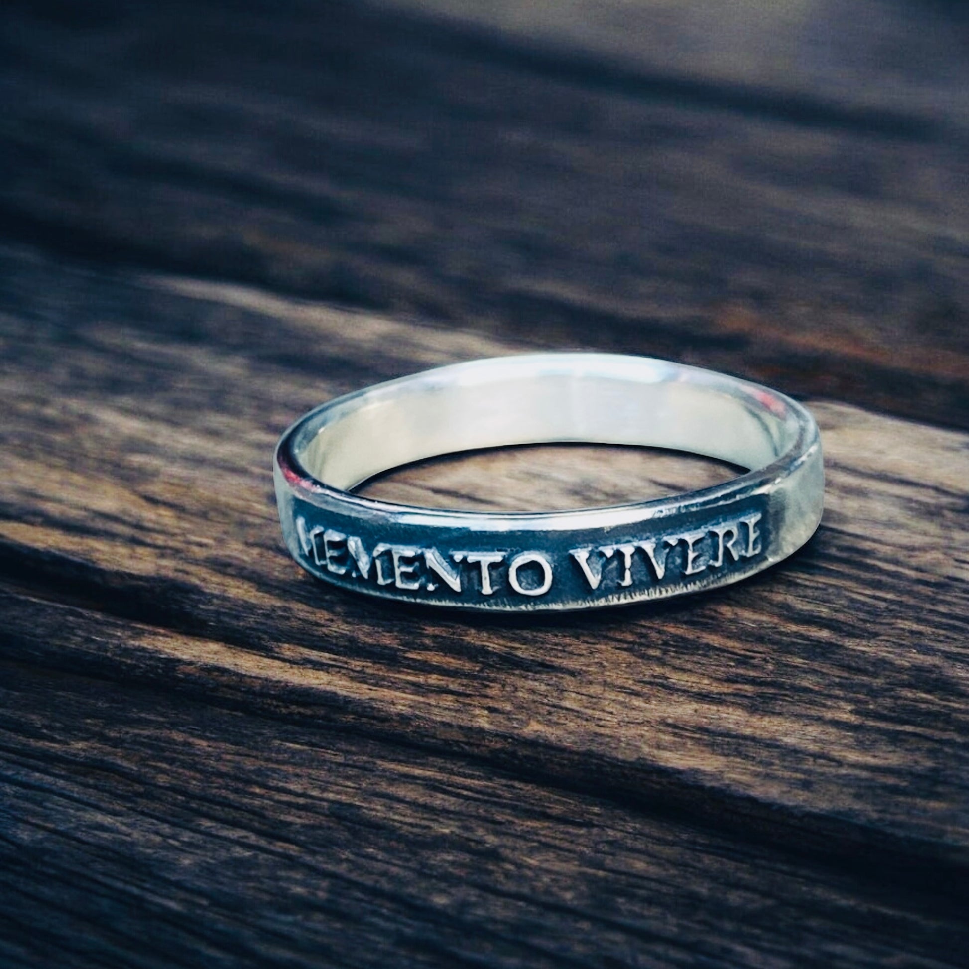 Latin for "Remember to Live," this handcrafted ring is a reminder that life is fleeting—and every day is a chance to focus on what truly matters. With raised lettering and a rustic finish, it’s both meaningful and bold—perfect as a gift or daily reminder.
